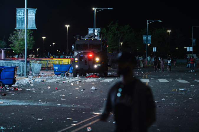 Following the initial disturbance just after 7 p.m., dozens of officers, some dressed in riot gear, lined the entrance, closing the gate even to ticketholders. Videos on social media showed some in the crowd outside reacting by throwing trash and bottles toward the officers.