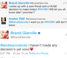 When viewers tweeted her about how upset they are that she isn’t returning, Brandi said she hasn’t made any decisions yet and will on Monday, as seen below: