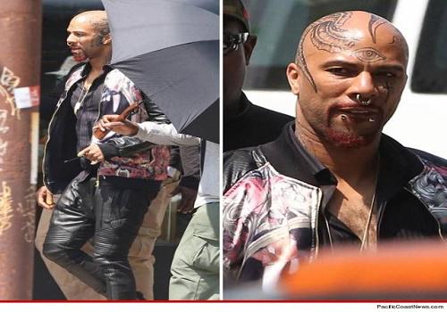 On set photo of Lonnie Rashid Lynn Jr., best known as the rapper Common was spotted wearing a leather wardrobe, tattoos and piercings as his attire.