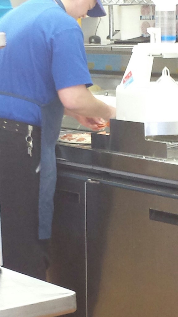 Well, the health department will take care of that. Oh, wait, they gave this Dominos an ‘A’ so I guess it’s fine for them to use their hands like that.