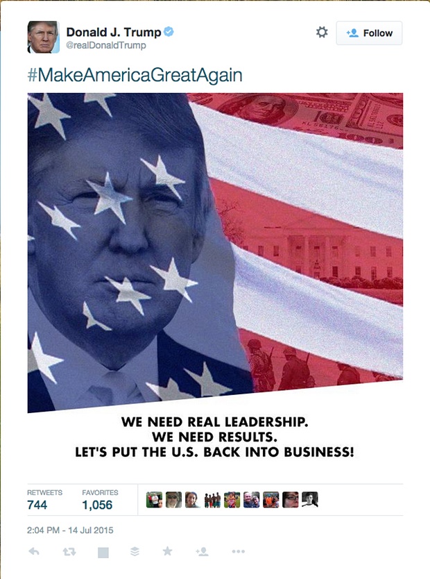 The real-estate mogul turned entertainer turned political rabble-rouser-in-chief tweeted a photo of himself on Tuesday – #MakeAmericaGreatAgain – followed by this photo: