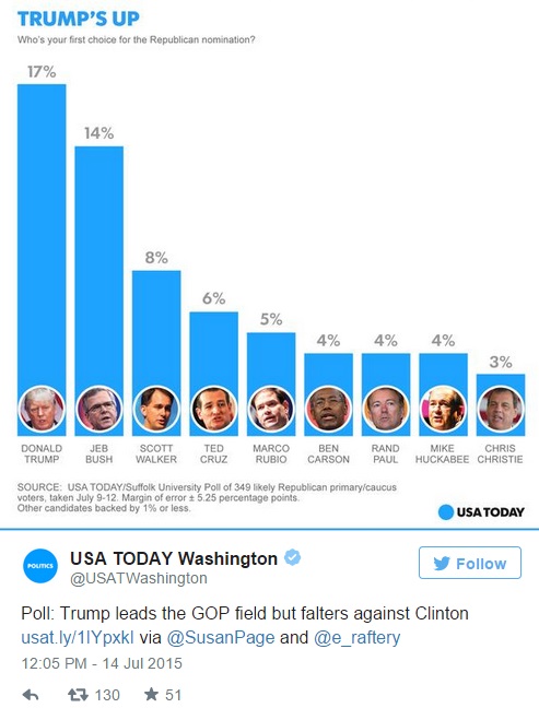 Currently Trump is the front-runner for the Republican race leading with a 17% approval rating followed by Jeb Bush at 14%. #LordHelpUsAll