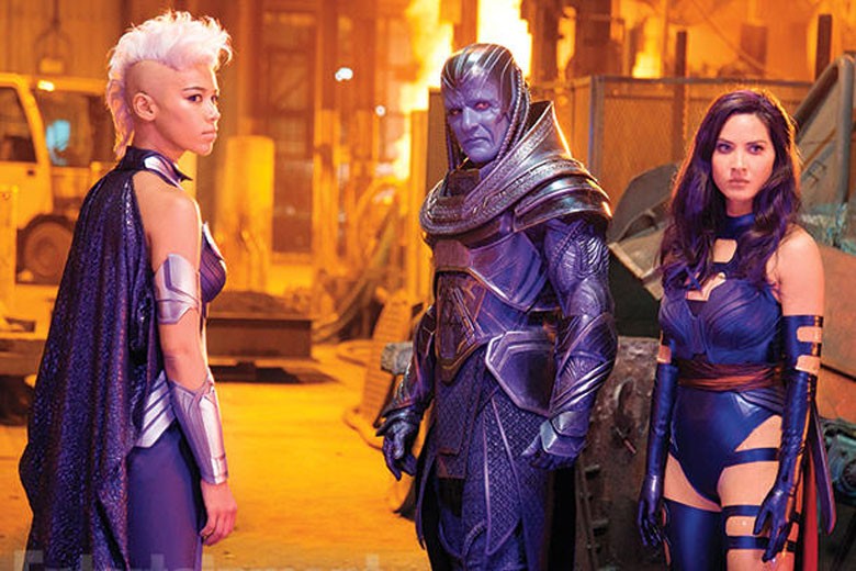 In a series of photos, the mag gives fans a first look at the film’s key villain: Apocalypse, played by actor Oscar Isaac. Here, he stands alongside Storm (Ororo Munroe) and Psylocke (Olivia Munn):
