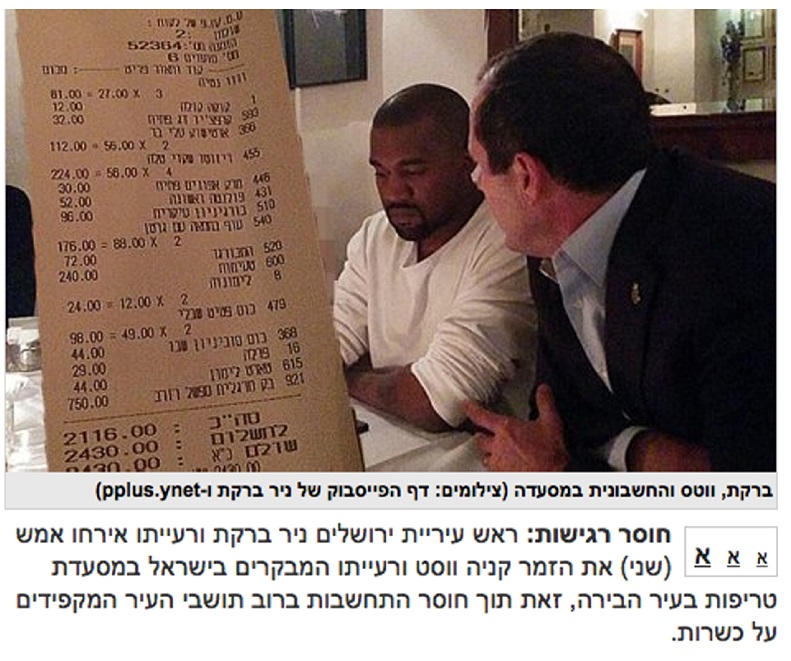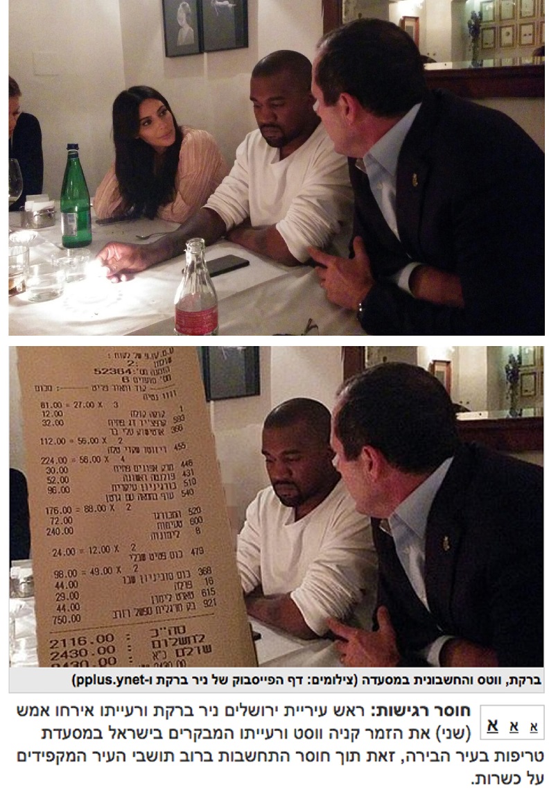 Get this, Kim Kardashian name was removed from the article as well since the article chiding Barkat for dining with them at a non-kosher restaurant, and Kardashian was referred to as “West’s wife.”