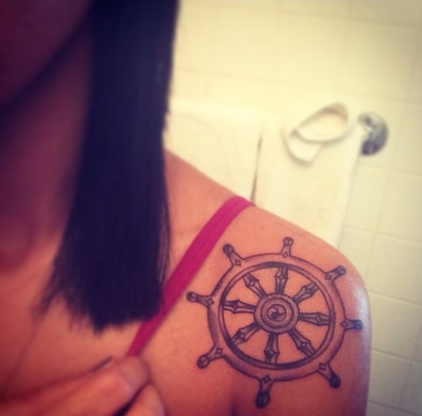 The “3:16AM” singer, Jhene Aiko post pics of her new Buddha Influenced tattoo which is a symbol of an eightfold path on her shoulder.