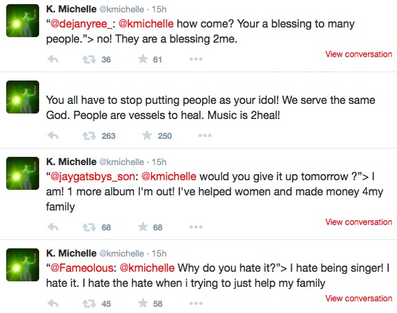 In a recent Twitter conversation, K Michelle told blogger Fameolous that the hate she gets from non fans makes her want to walk away from it all.