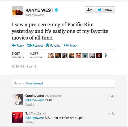 Despite the fall of Kanye West‘s Yeezus album the rapper saw Pacific Rim and he loves it!