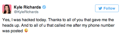 “Yes, I was hacked today. Thanks to all of you that gave me the heads up. And to all of u that called me after my phone number was posted.” She later added that she was freaking out!”