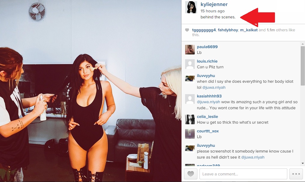 The Keeping Up With the Kardashians star posted a behind-the-scenes picture to Instagram Saturday, where she decided to directly address any haters that would comment on her body. Dressed in a risqué black swimsuit and thigh-high lace-up boots, Kylie captioned the picture: