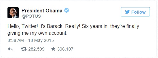 Obama’s @POTUS account became the fastest to reach 1 million followers, hitting the milestone in under five hours.