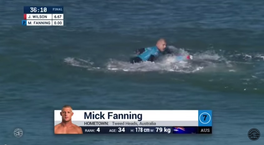 As an announcer tells people to get out of the water, the Water Safety Team rushes forward and pulls Fanning and his competitor Julian Wilson out of the water and onto a rescue boat.
