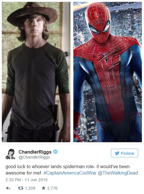 Then on Thursday, The Walking Dead actor Chandler Riggs posted an image to twitter along with saying “good luck to whoever lands Spider Man role – it would’ve been awesome for me!”