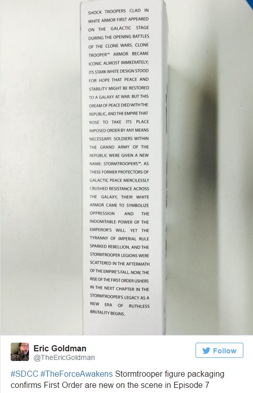 That’s one side of the box in which the First Order Stormtrooper action figure will be packaged when it’s for sale at Comic-Con in July. Most of it is the history of the Stormtrooper, beginning with the Clone Wars, moving through the fight between the Galactic Empire and the Rebellion and teasing The First Order and “a new era of ruthless brutality.”